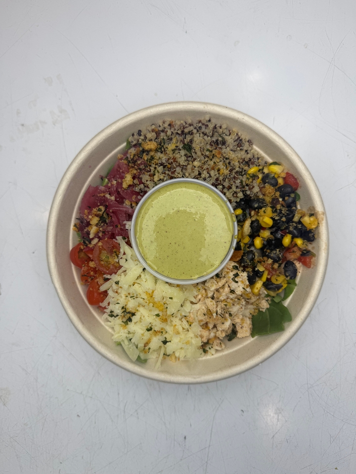 Chicken, organic quinoa, black bean relish, tomato, pickled red onion, manchego cheese, gremolata breadcrumb with aji verde dressing